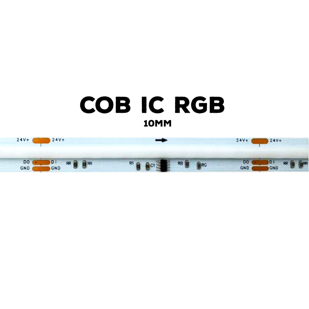 Bring your lighting designs to life with the COB IC RGB LED Strip Light. Featuring 576 high-brightness chips per meter and a WS2811 IC for full RGB control, this strip offers seamless, colorful illumination with excellent uniformity. The 10mm wide flexible PCB and 62.5mm cut intervals provide excellent customization options for signage, displays, and architectural lighting. Powered by 24V DC. Ideal for indoor installations in commercial and decorative settings.